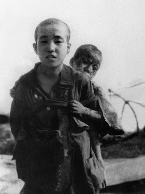 Jovem carrega o irmão mais novo ferido no bombardeio atômico em Hiroshima; a foto é de 10 de agosto de 1945